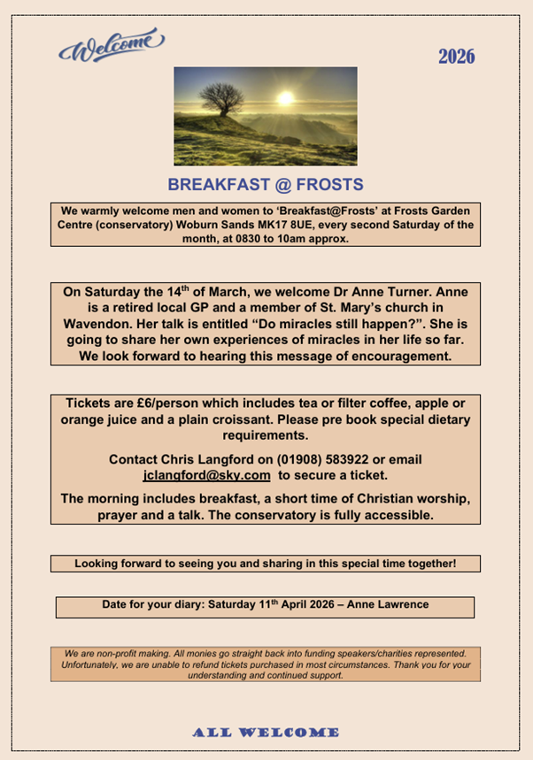 A popular event for adults, at Frosts Garden Centre (conservatory), Woburn Sands, MK17 8UE, every second Saturday of the month at 8:30am until approx 10am. The morning includes breakfast, a short time of Christian worship, prayer and a talk.