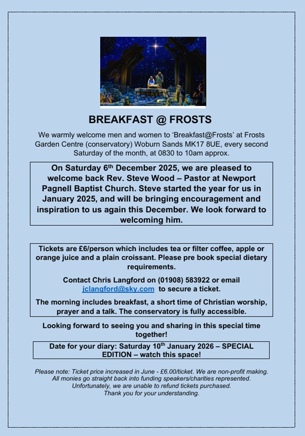 A popular event for adults, at Frosts Garden Centre (conservatory), Woburn Sands, MK17 8UE, every second Saturday of the month at 8:30am until approx 10am. The morning includes breakfast, a short time of Christian worship, prayer and a talk. Next month’s session will be a week early on 6th December, with guest speaker Rev. Steven Wood. See below for details of how you can book your place: