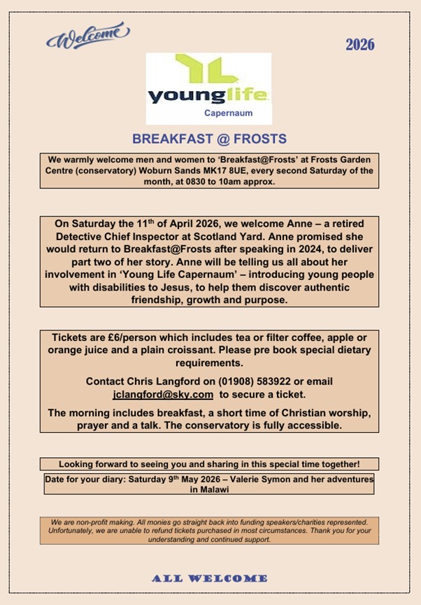 A popular event for adults, at Frosts Garden Centre (conservatory), Woburn Sands, MK17 8UE, every second Saturday of the month at 8:30am until approx. 10am. The morning includes breakfast, a short time of Christian worship, prayer and a talk.